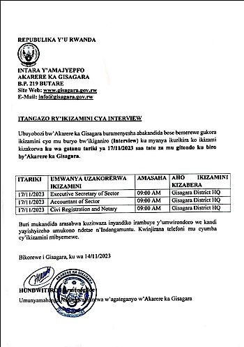 Ubuyobozi bw’Akarere ka Gisagara buramenyesha abakandida bose bemerewe gukora ikizamini cyo mu buryo bw’ikiganiro (interview) ku myanya ikurikira ko…