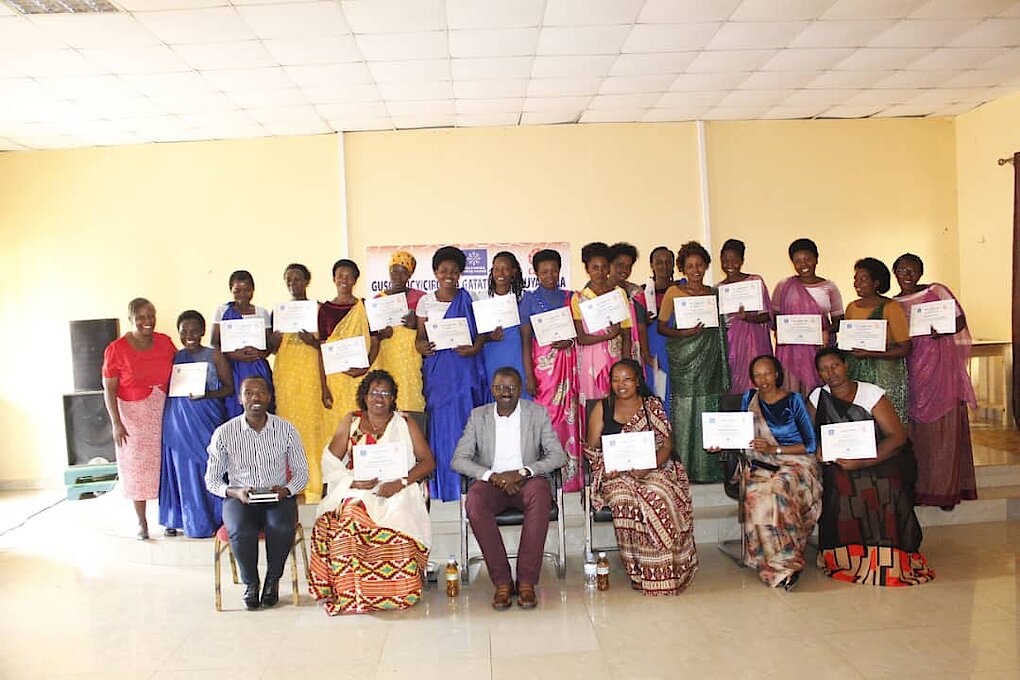 2. Mu cyumba cy'inama cya YEGO Center, PFTH ku bufatanye na CARE Rwanda hatanzwe impamyabumenyi ku bagore (mentees) 20 baturutse mu nzego zitandukanye mu Mirenge 6 PFTH ikoreramo bakurikiranye amasomo muri gahunda y’ ubujyanama mu buyozi (leadership mentorship program). Ni urugendo bamazemo amezi 6, bafashwa n’abatoza babizobereyemo (mentors) mu rwego rwo kongerera abagore ubushobozi mu kuzamura ijwi ryabo no kugira uruhare mu nzego zifata ibyemezo.