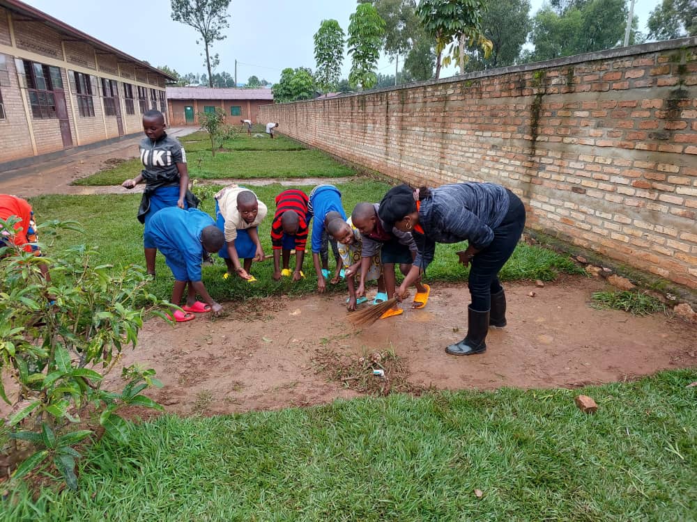 VM AFSO Denise Dusabe yitabiriye umuganda mu Murenge wa Ndora, Akagari ka Gisagara, aho yafatanyije n'abanyeshuri gukora isuku y'ikigo cy'amashuri cya GS Ndora n'impande zacyo mu rwego rwo gutoza abana isuku.