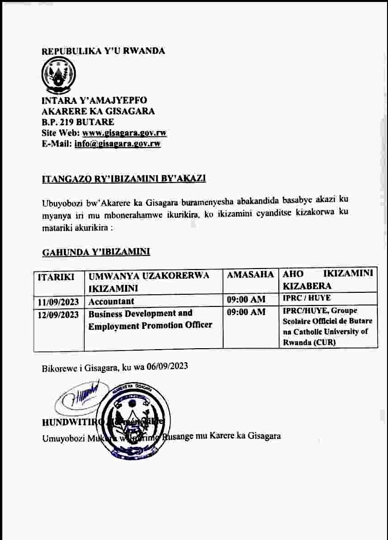 Ubuyobozi bw'Akarere @GisagaraDistr buramenyesha abakandida basabye akazi ku myanya iri mu mbonerahamwe ikurikira, ko ikizamini cyanditse kizakorwa ku matariki agaragara kw'itangazo.