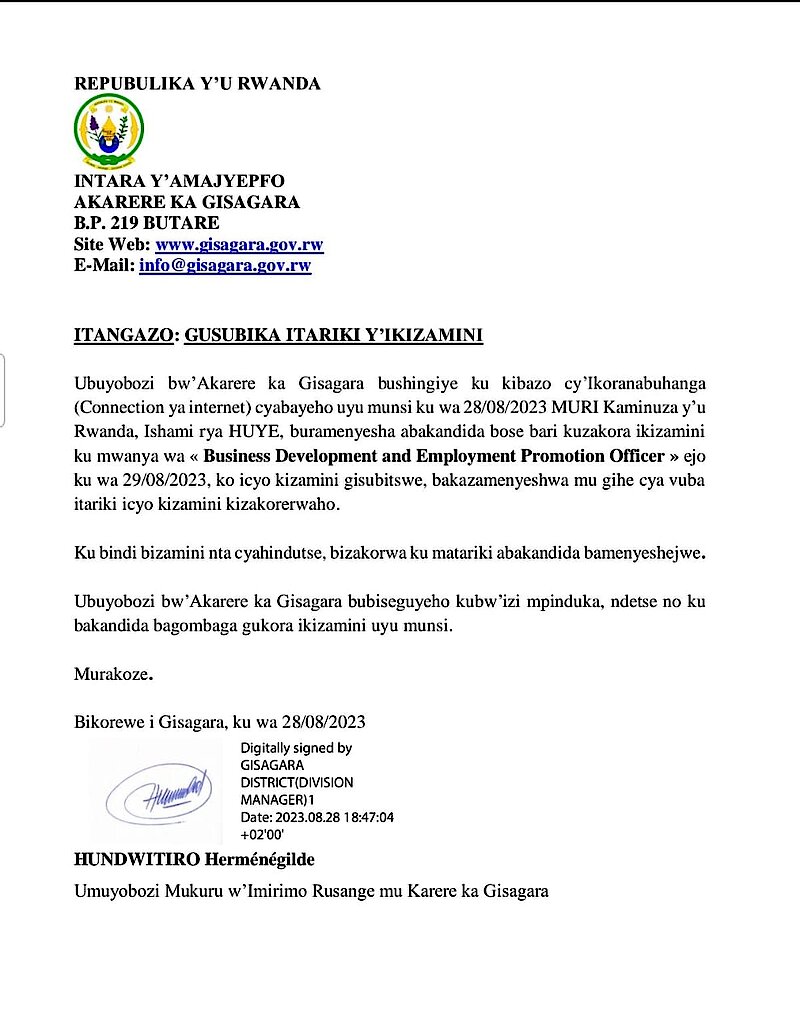 Ubuyobozi bw'Akarere ka Gisagara, bushingiye ku kibazo cya Internet Connection cyabayeho muri Kaminuza y'u Rwanda Ishami rya Huye, ahari hateganyijwe gukorerwa ikizamini, buramenyesha abakandida bari kuzakora ku mwanya wa Business Development and Employment Promotion Officer ejo kuwa 29/08/2023, ko ikizamini gisubitswe. Indi tariki barayimenyeshwa bidatinze.