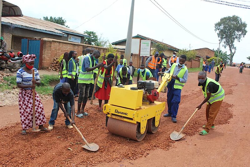 Bakoranye umuganda n'urubyiruko, bashyira laterite mu muhanda wa Ndora-Musha ahangijwe n'umuvu w'amazi bakanatsindagira n'imashini za bugenewe (compactor).